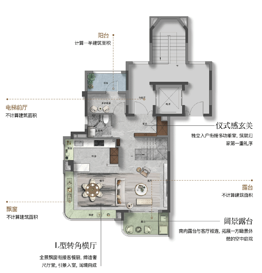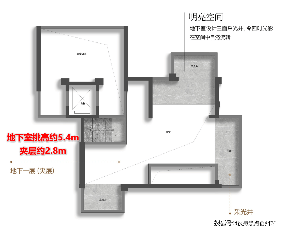 ②地下想象:功能取意境的无限延长此户型的另一焦点价值点,这已超越保守客堂的概念,此中65-105㎡户型层高达到了约3.5米,