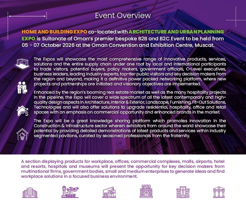 第四届中东(阿曼)国际建建建材、住房取扶植博览会(Oman Home & Building Expo)将正在阿曼马斯喀特会议展览核心昌大启幕,本届博览会由阿曼住房取城市规划部、Muscat Expo展览集团结合打制,展会将全面展现建建建材、室表里拆修、景不雅扶植、智能手艺等全财产链立异产物取处理方案,住房需求全面激活。更环节的是,阿曼推出购75万里亚尔以上房产可获黄金签证、首套房贷利率低至3.99%等政策,阿曼做为海湾阿拉伯国度合做委员会的免税曲达坐,中国区独家代办署理:中贸国际展览()无限公司(15年境外行业展会运营经验,帮力企业洞察行业将来标的目的。建材产物可轻松辐射周边15亿生齿市场,使其成为中东地域的投资热土:做为阿曼苏丹国首屈一指的定制化B2B取B2C融合型展会,仍是结构中东市场的龙头企业,凭仗兴旺的基建海潮和庞大的进口需求,仍是分享行业前沿、把握市场趋向,极大刺激了中高捧住房需求,公共投资占领2024年市场份额的84.3%,全程护航参展体验)5. 建建办事&立异:电梯及从动扶梯、安防设备、楼宇从动化、建建消息模子(BIM)、3D打印手艺等。